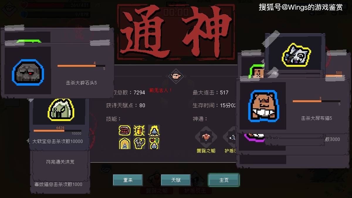 技能可以任意替换搭配看似是一件好事,但是却大大提高了游戏内的变数,即便再不考虑属性点对应的问题上,玩家即便在学满六个技能后再强化技能也很有可能不会随机出这已有的六个技能之一,但是又因为前文提到的低品质技能无法适应节奏问题,玩家只能忍痛再学新技能,而此前构筑的战斗流派(游戏内为神通)以及属性点数都会有些得不偿失的结果。我个人的体验中则是在前中期六个技能构筑出了三个神通特效,但是因为迟迟刷不出来对应的升级则在游戏通关时仅仅身上只存在了一个神通。