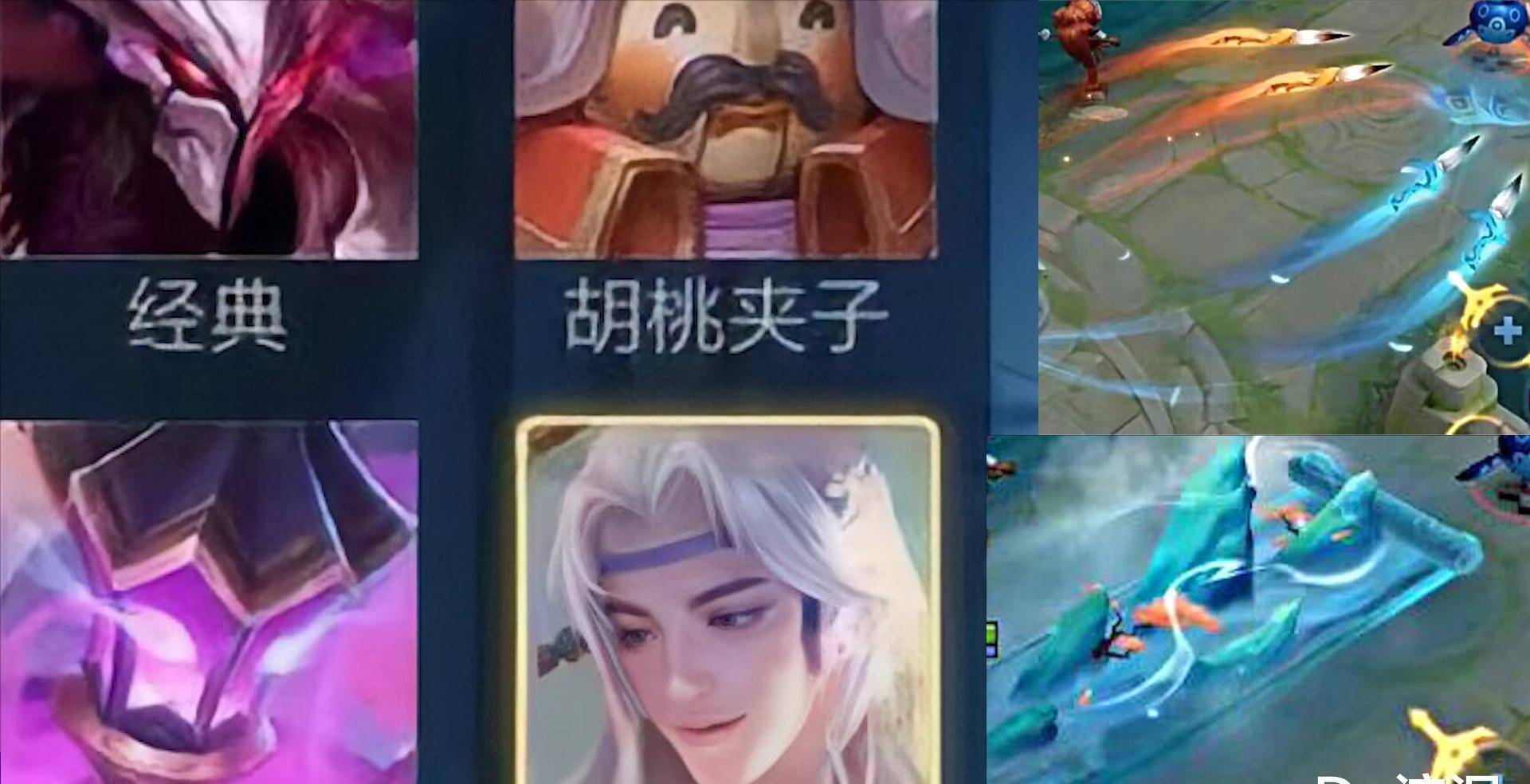 然后是干将的古风皮肤,在这款皮肤中,干将终于完全卸下了头盔,白发造型,看起来眉清目秀的。局内特效黄蓝为主,一技能在地图上留下一幅山水画,画里高山流水。开启大招后,周身环绕着飞鸟和游鱼,技能丢的是毛笔。