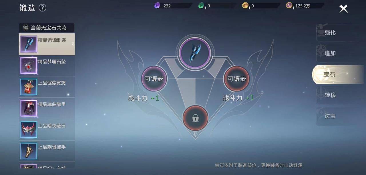 玩家镶嵌宝石的过程中,每件设备可镶嵌3颗宝石,此外,只有设备对宝石有共鸣的时候才会镶嵌。宝石镶嵌后装备可获得与宝石相对应的属性,如果玩家更换了装备,原有装备上的宝石会自动与同一装备上的宝石进行嫁接。此外,宝石也可以合成获得品质更好的宝石。