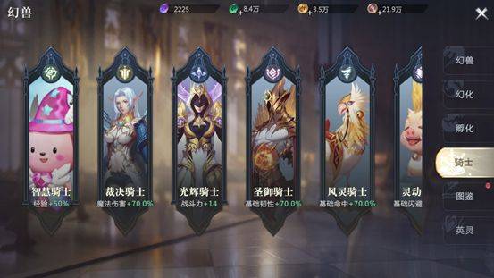 首先,在幻兽面板中,玩家可以看见幻兽面板分为了幻兽、幻化、孵化、骑士、图鉴和英灵等6大页面。在幻兽页面中,还可以查看到当前所拥有的幻兽,查看幻兽的星级、属性并进行出征、召回、合体、休息等设置;在幻化页面中,玩家可以利用幻兽进行主属性、副属性、初始值和幸运值的四种养成;在孵化页面中,神选者可以查看正在孵化中的幻兽蛋以及所需时长,并可以将已经孵化的幻兽取出或进行一件孵化等操作;在骑士页面中,神选者可以将已有的幻兽进行骑士任命,从而获得属性加成;在幻兽图鉴页面,神选者可以查看目前游戏中所有的幻兽及其幻兽类型、属性等信息。在英灵页面中,神选者可以将自己拥有的多余的幻兽,转化为灵石,并通过灵石召唤新的幻兽。