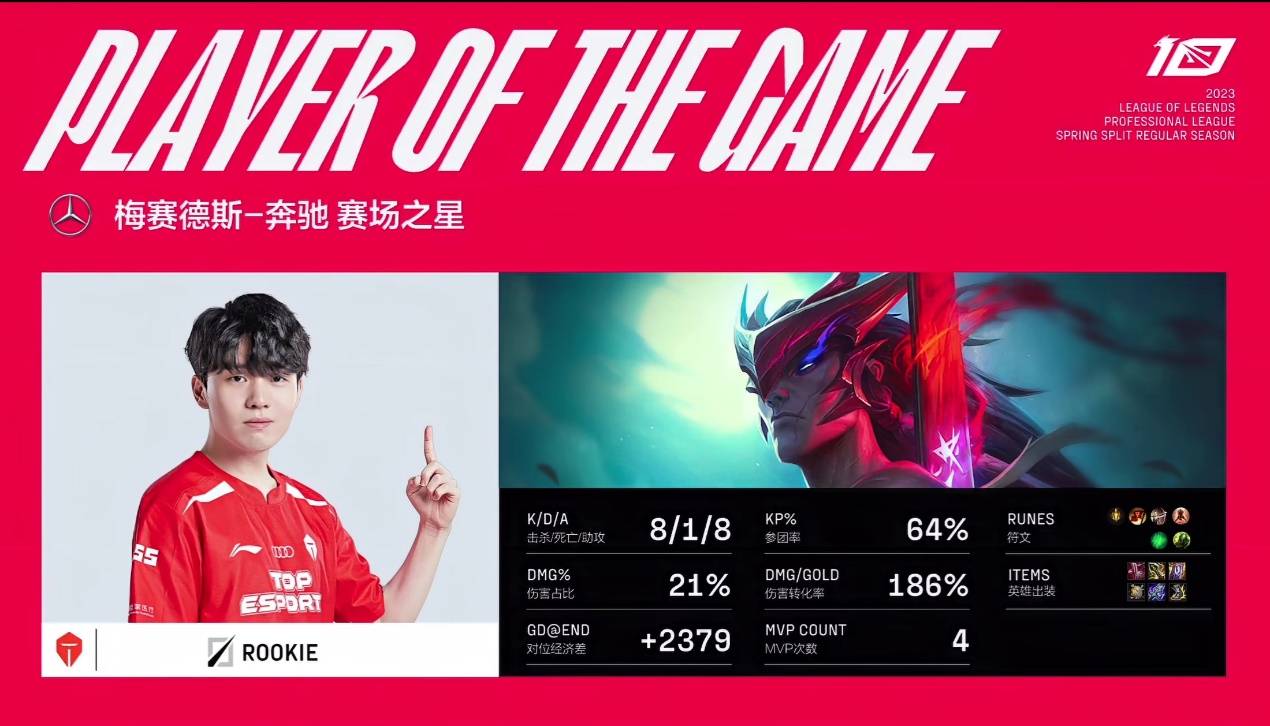 三局比赛其实TES都是前期表现更好的一方,唯一输掉的一局是在巨大优势的情况下,中期处理接连出现失误,JKL的泽丽出现过进场失误,Rookie连续入侵野区也给了机会,在比赛结束后的直播中,Rookie也是主动承认错误。