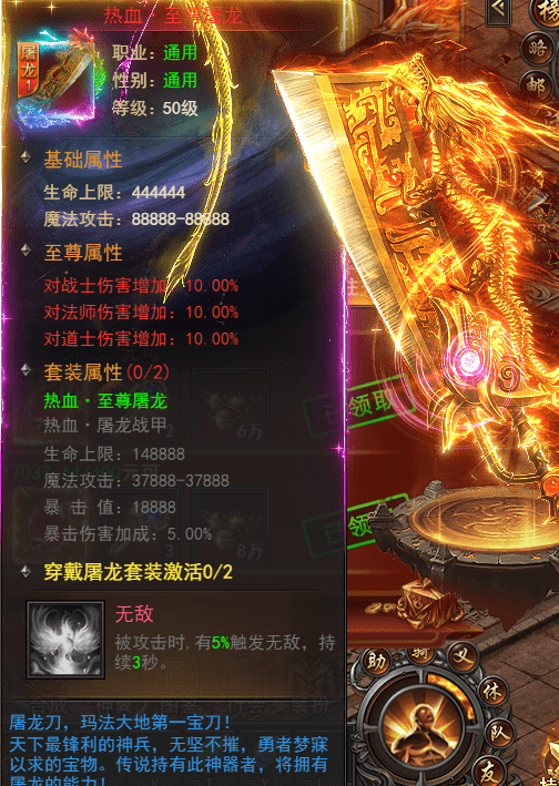 3. 可以看下屠龙刀的属性,生命上限跟魔法攻击都是狠不多的,还有至尊的属性,集齐一套的话还可以激活套装属性,激活屠龙技能。