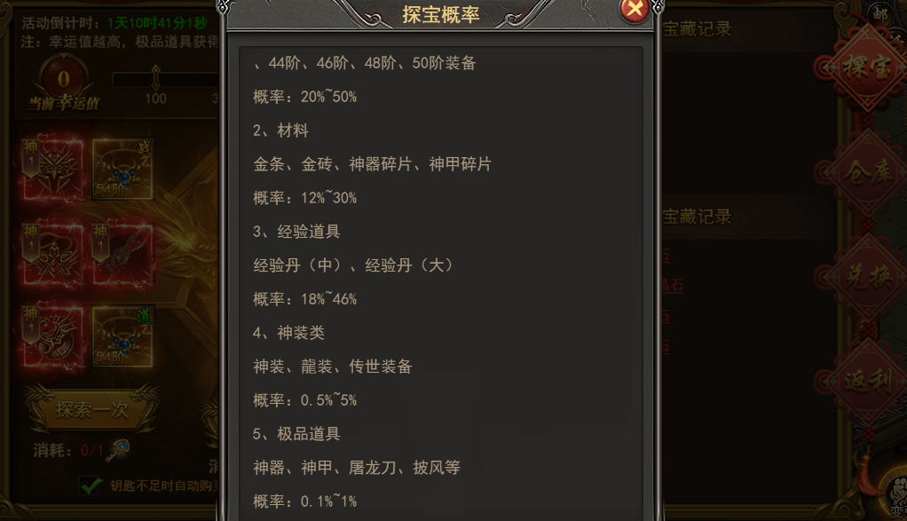 2. 第二就是龙窟探宝,玩家可以存一些探宝的钥匙,进行探宝,幸运值达到定点的时候会出极品的装备,包括屠龙到,但是几率不高。