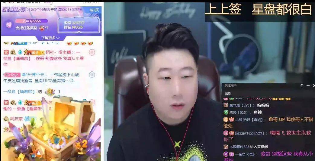子龙不开播,阿布播户外在黄金档,星秀除了捧我也真没人,况且自己还能圈几手66给虎牙顶上一顶,否则连66都吃不上。后续默念哥互动闲聊。鱼哥空降豪刷互动骚俊表示从小就看了