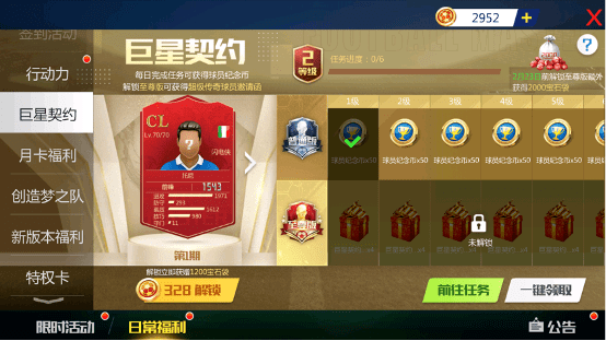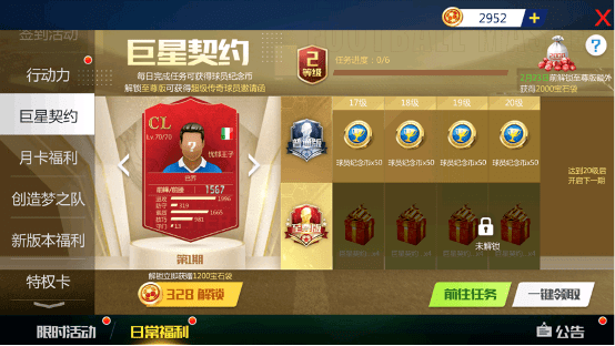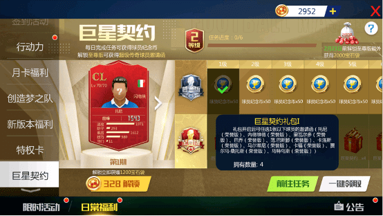 各位经理人可以通过日常活动进入巨星契约,巨星契约分为普通版和至尊版,普通版可领取球员纪念币,解锁至尊版更可获得巨星契约礼包,礼包可在10位巨星中选取其中一人的邀请函进行领取。