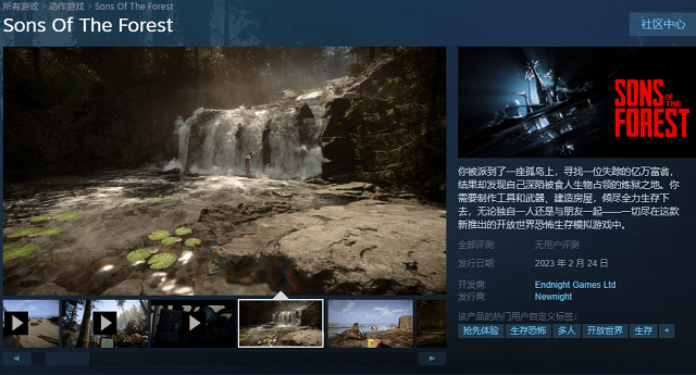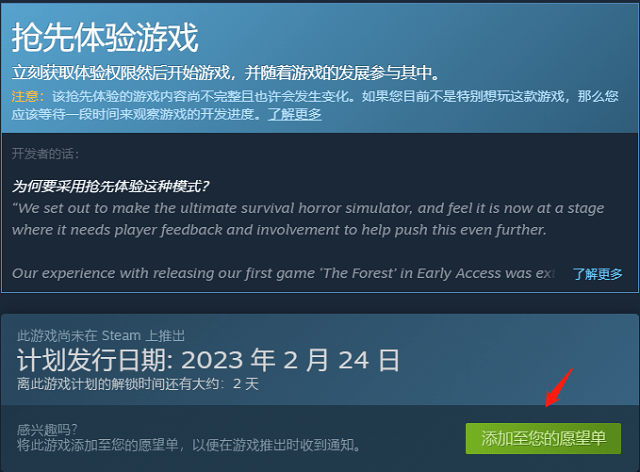 进入森林之子游戏页面后,页面下滑找到“添加愿望单”按钮,等到游戏在2月24日正式开放游玩,就可以点击下载了。