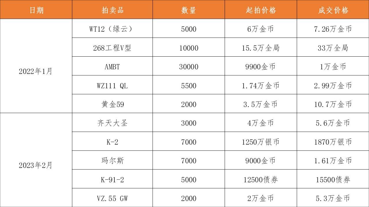 去年1月一锤定音活动中,拍卖品是5辆车,分别是WT12、268工程V型、AMBT、WZ111QL和黄金59。其中AMBT基本上是以底价完成的,其余车辆都有不同程度的溢价,黄金59甚至是起拍价格的3倍以上。绿云的价格年初要到7.26万,去年8月份我是6万金币左右拿到的,各位可以参考这个价格。