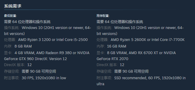 据描述《原子之心》1080p 60帧低画质需要GTX 1060显卡,1080p 60 帧中画质需要GTX 1070,1080p 60帧高画质需要GTX 1080,1080p 60帧极高画质需要RTX 2070S,4K 60帧极高画质需要RTX 3080,另外还需要90GB的存储空间。