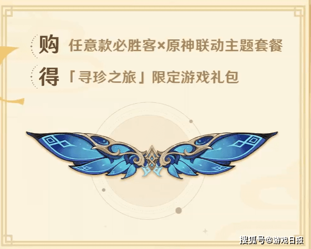 先来说说原神和必胜客第二次联动的主要内容。最重磅的肯定还是游戏内的联动款翅膀,和上次一样,双方的联动在游戏内的道具下了很大功夫。这次的翅膀和上次的泡泡小相机都持续选用了蓝色的色调,并且在花纹图案上做了全新的设计。从实机演示来看,这款联动翅膀可能会非常适合蓝色调的水系角色,尤其是莱依拉、散兵、夜兰等,用上这个翅膀简直是绝美!