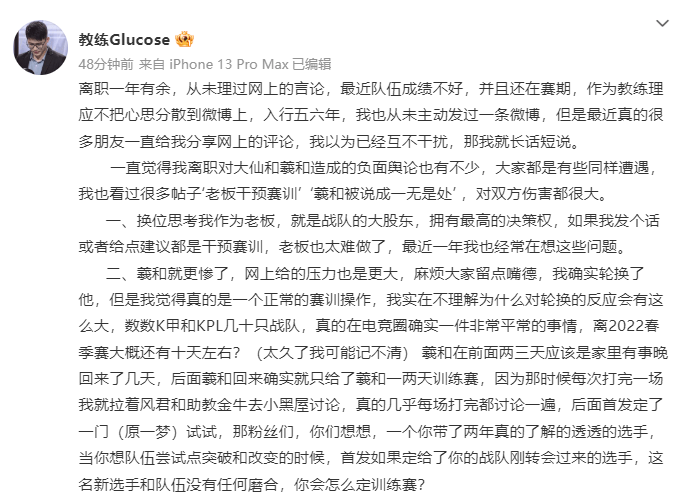 只有赛中离职这一点葡萄糖觉得有点对不起粉丝,显得有点没有责任心了。想想XYG在葡萄糖带领下是拿过四强的,后面就一直在走下坡路了。葡萄糖教练为什么离职,恐怕只有他自己最清楚,但XYG的粉丝们确实没有理由怪他,毕竟也是一点一点带着队伍成长的,离职也不是什么天大的过错。如今葡萄糖已经在NBW战队执教一段时间了,也比较稳定,如果不是一直被骂的话,估计也不会站出来回应。XYG现在还是应该关心一下自己队伍的成绩,何必那么在意前任呢。