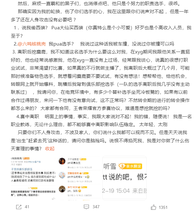 XYG前教练葡萄糖发文回应,自己没有pua选手,大仙和羲和都没问题