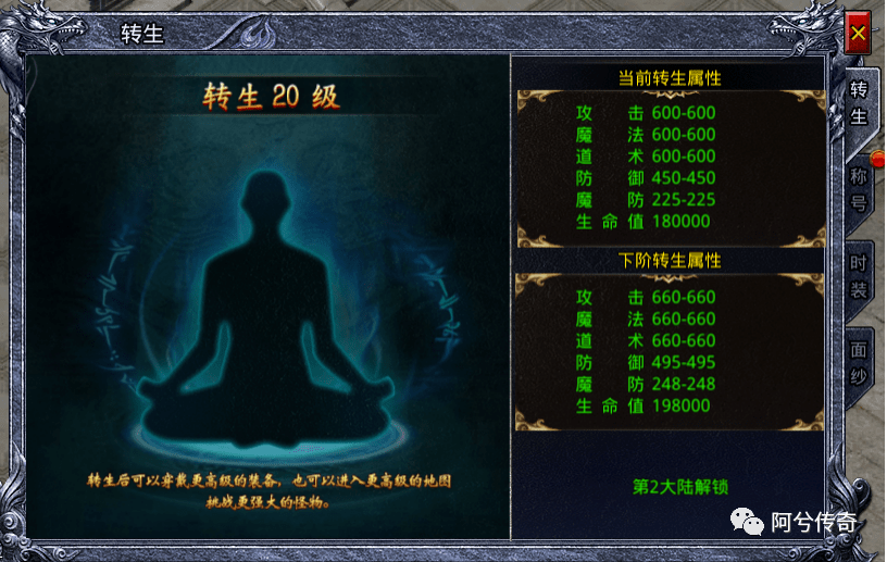 转生系统最高为120转,每个大陆都有转生的升级上限,转生可增加角色攻击、魔法、道术、防御、魔防、生命值等基础属性。转生升级需要消耗元宝或灵符,转生达到一定等级可进入更高等级的地图和穿戴更高等级的装备。