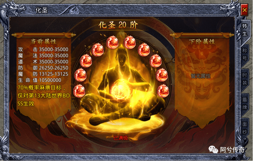 转生满级之后开启化圣,化圣等级最高为20阶,化圣可增加角色更多的攻击、魔法、道术、防御、魔防、生命值等基础属性和特殊属性,化圣升级需要消耗元宝或灵符。