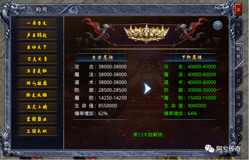 共有46个个人称号,每个称号都有专属的称号特效装扮,每个大陆都有称号的升级上限,可增加角色攻击、魔法、道术、防御、魔防、生命值等属性,称号升级需要消耗元宝或灵符。