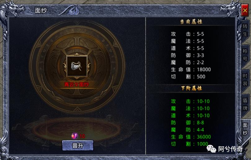 每个大陆都有一个专属的时装、盾牌、面纱,可增加角色攻击、魔法、道术、防御、魔防、生命值等属性,时装、盾牌、面纱升级需要消耗专属道具。