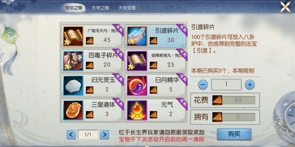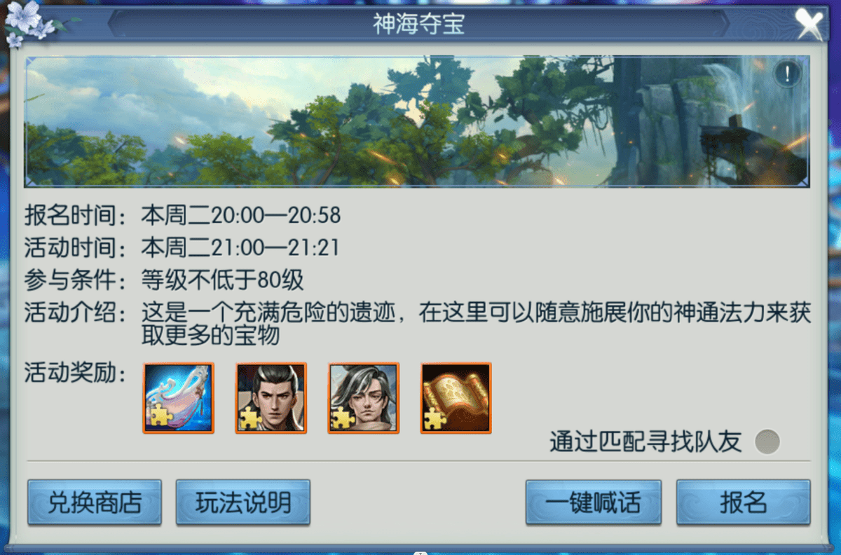 在活动期间,击败神海守护者以及遗迹中的怪物们都会掉落宝物,每个阶段结束后,仙友手中的宝物都会被自动转化成一定数量的代币,这些代币可以在商店中兑换包括法宝碎片、丹方在内的各种稀有道具哦,大家赶紧去试试吧!