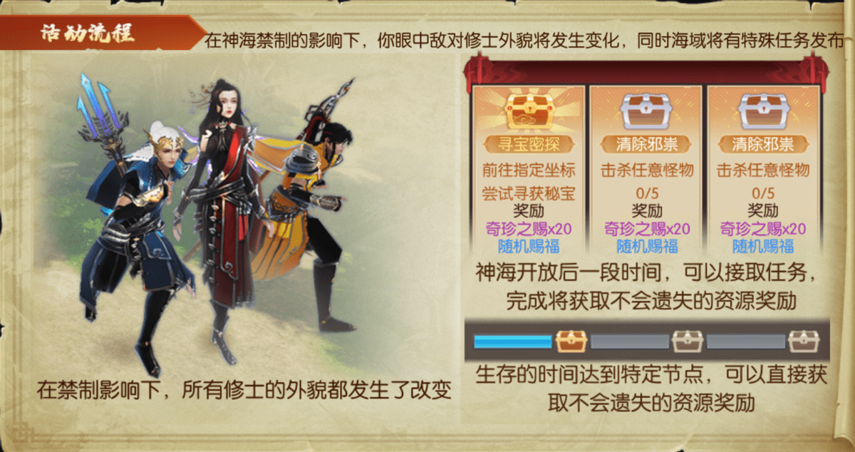 遗迹一共分为外海区域、内海区域和鲛海禁地三个区域,相应的,活动也分成了三个阶段来进行。首先在第一阶段,地图上会出现大量怪物,参赛玩家需要击败这些怪物和其他仙友,并且争夺地图内的宝箱来获取积分;到了第二阶段,玩家就需要击败外海或者是内海的守护者了,守护者死亡时会掉落大量的积分,以及内海行令或者禁地玉符;最后是第三阶段,拥有内海区域和禁地玉符的人在地图上会被标记出来,这个期间,区域内的其他仙友可以攻击他们抢夺信物,最终获得信物的队伍成功进入下一关。