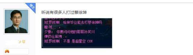 除此之外,蔡徐坤还被广大DNF游戏玩家比喻成超星空CXK,在玩DNF游戏的时候经常遇到蔡徐坤网友如此说到:哈林毕业能去打蔡徐坤(超星空)吗?DNF蔡徐坤成地下城新副本代言人?ikun粉丝遍布整个dnf游戏!DNF蔡徐坤被比作超星空,你打算用什么职业去拯救他?