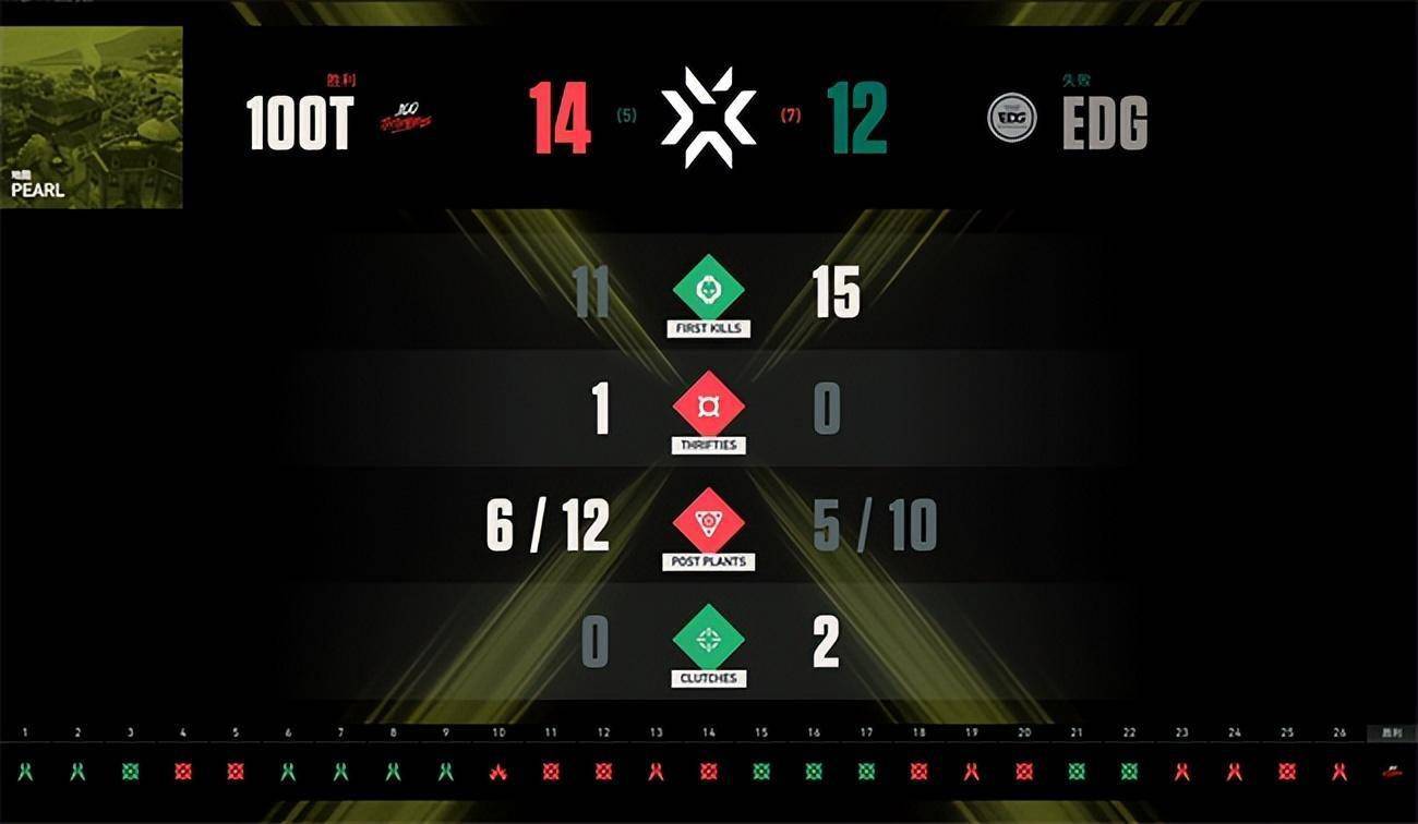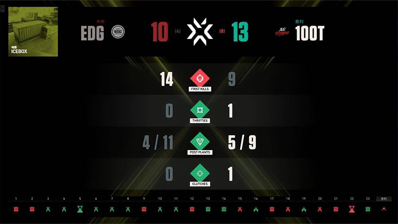 第一局加时赛100T重兵进攻A点,双方杀红了眼各种正面对枪,Haodong最后没能拆包成功被穿死,100T拿下加时赛第一局,比分反超EDG拿到了赛点。无论是大赛经验还是比赛心态都稍显年轻的EDG在这种紧张的时刻还是没能再次创造奇迹,100T通过迅速的回防配合拿下了加时赛第二局,最终比分14:12惊险战胜EDG。总比分2:1淘汰EDG晋级下一轮。EDG距离创造历史只有一步之遥,但他们将北美豪强100T逼入绝境的精彩发挥已经不留遗憾!我们下次国际大赛再见!
