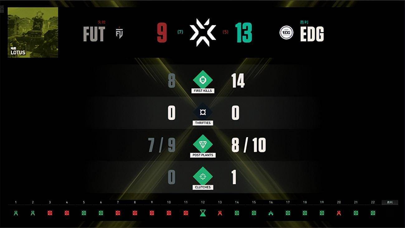 第二张地图开局EDG作为守方打的很有章法,通过出色的控图能力预判到100T的绕后意图,连续拿下手枪局以及次局,但在拥有经济优势的情况下EDG在第三局被100T打出0换5。顺势又输掉第四局。莲华古城比较考验防守方的回防协调,在100T紧密的补枪配合以及灵活转点之下,EDG只能凭借选手的高光操作尽力在上半场追分,EDG再拿两分以后100T叫出暂停调整战术,归来连追5分。EDG随后也叫出暂停,最终拿到上半场的最后一局,以5:7的比分进入下半场。