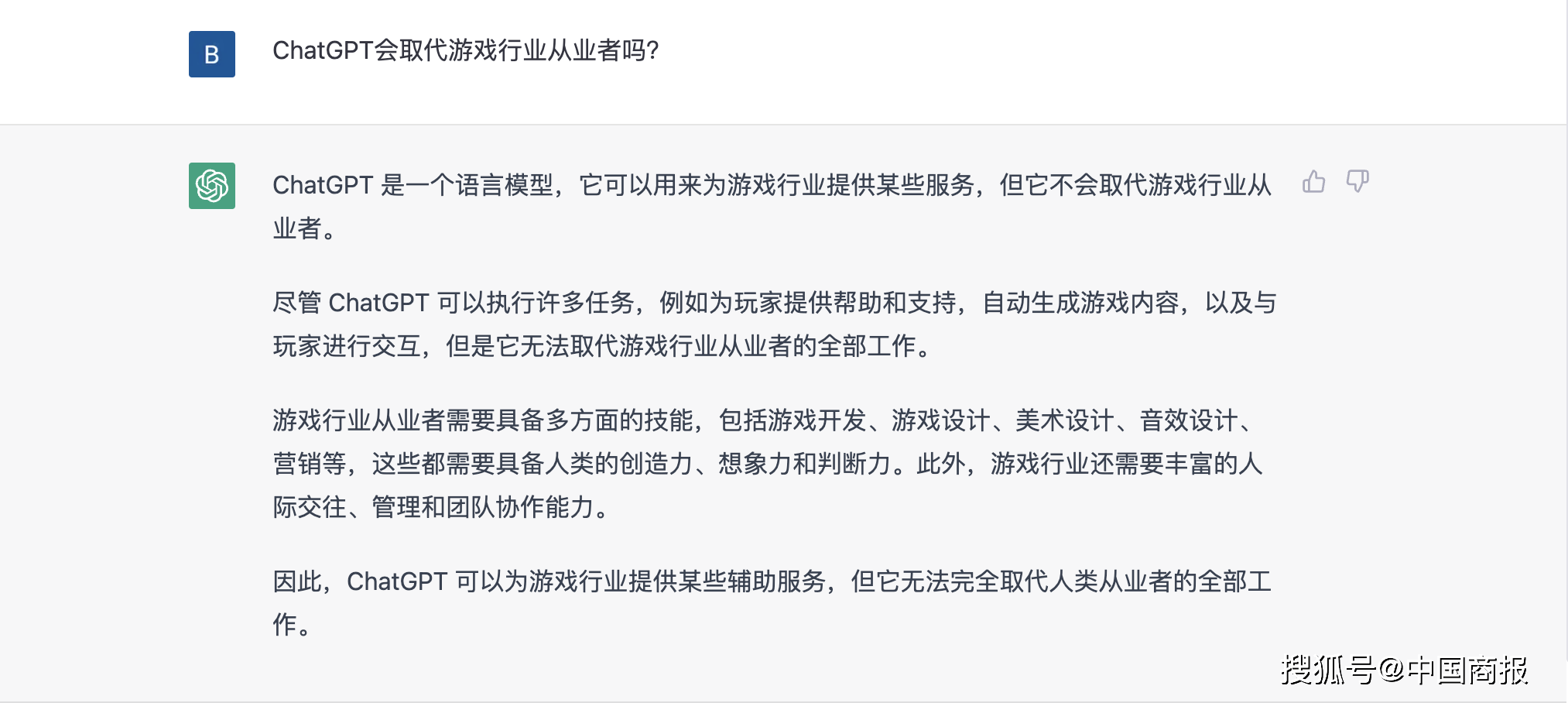 ChatGPT表示不会取代游戏行业从业者。