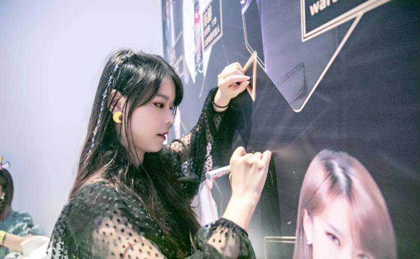 在展板上,沫子留下了自己的笔迹!仔细看一下,确实有龙飞凤舞之感!但字美还是不如人美。沫子俏美的模样,让人怎么舍得把眼神偏离呢?