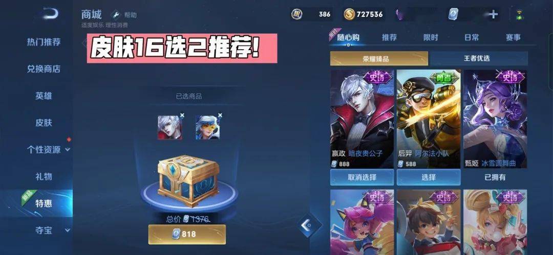 最后游戏商店还在24号上架了随心1+1礼包,该礼包限时上架一周时间,玩家消耗818点券即可16款皮肤任选其二,包含了史诗和勇者伴生皮肤两个档次的皮肤,那么是否值得消耗点券兑换呢?在小编看来,818点券兑换两款皮肤不如神秘商店划算,毕竟神秘商店拿到半价的话,消耗888点券可以得到两款史诗皮肤,而818点券只能兑换一款史诗和一款勇者(或伴生皮肤)。当然等不及神秘商店的玩家无需考虑,不过建议优先选择李白千年之狐、嬴政暗夜贵公子和孙尚香的沉稳之力,这三款皮肤目前还无法通过碎片商店免费兑换!