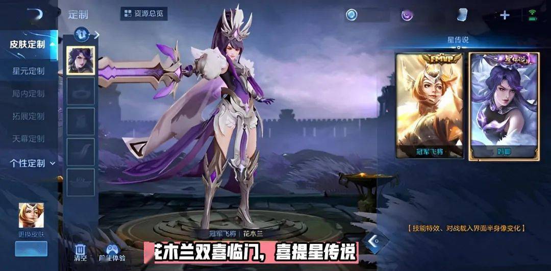 而花木兰“燃星之曲”才刚上架,又迎来了一个好消息,Fly的定制传说“冠军飞将”将在未来推出一款星传说皮肤,与原皮肤的橙黄色调不同,木兰星传说为紫发银甲,紫色宝剑预示局内特效也是紫色光效。这也是FMVP传说系列的首款星传说,预计不会以抽取的方式获得,因此有需求的小伙伴可以提前积攒300紫星币备用了!