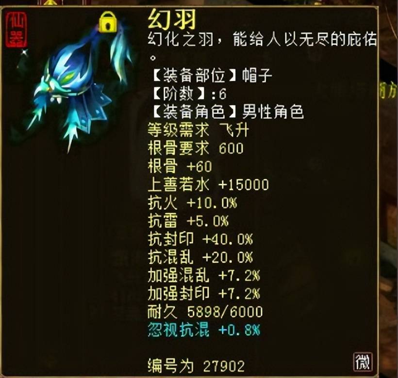 再来看这件六阶帽子,蓝字忽视抗混,这似乎也是当今仙器男人的主流配置,只要是有点条件的男人,在选择仙器时,都会优先考虑蓝字的忽视抗混属性。