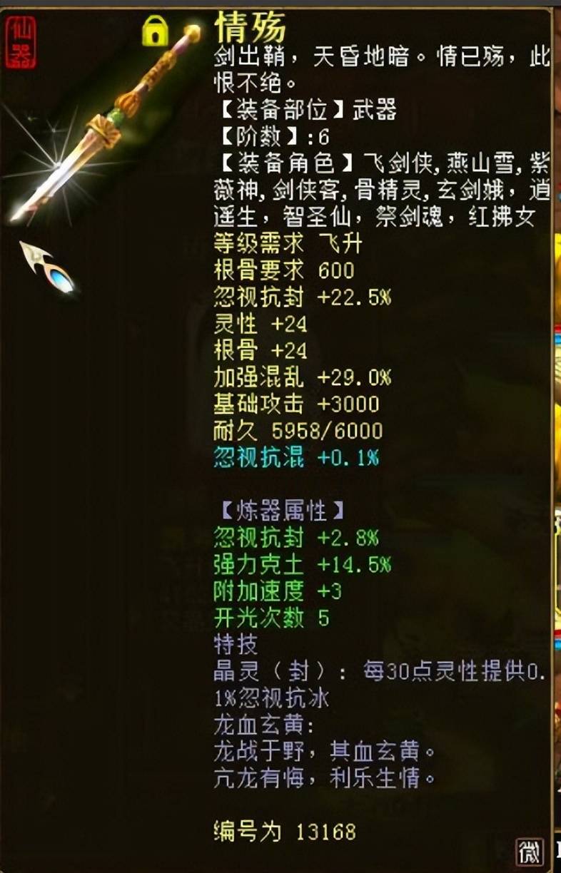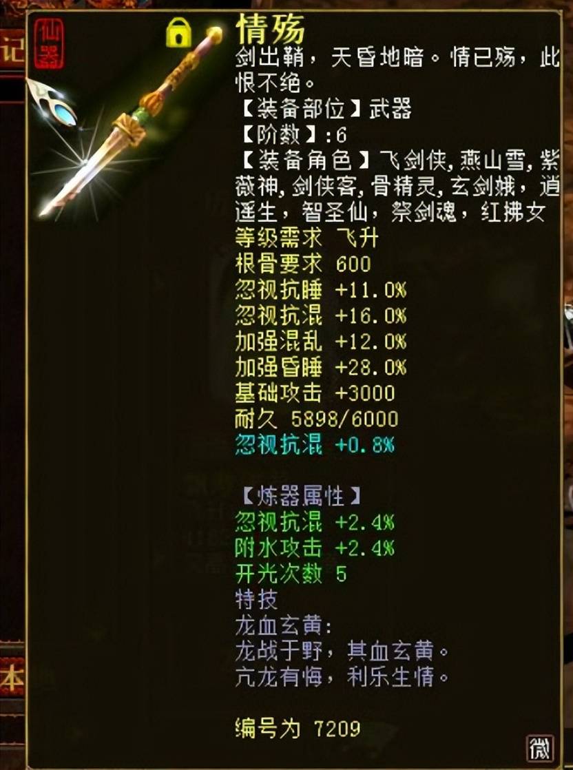 这些年,在大话圈子里出现过不少神豪,早年间,飘渺郎君的名号响彻了大江南北,那么大家见过,几年前飘渺郎君使用过的装备吗?早在之前,有过飘渺郎君物资相关的官方报道,眼前这件六阶混武器,据说是当时疑似飘渺郎君的武器,蓝字忽视抗混0.8,算是做到了极品,不过炼器忽视混2.4,对于一件开光过5次的仙器来说,有一些不太对题。