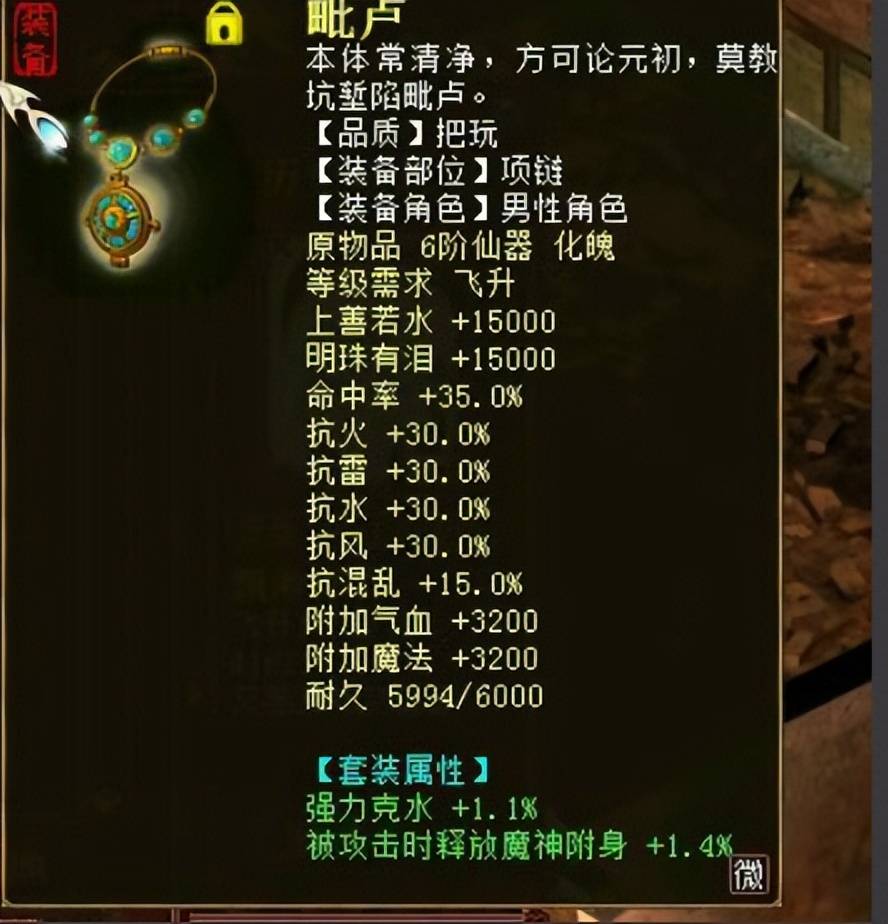 再来看这条链子,一般情况下,如果不考虑忽视混属性的话,男人会在选择仙器时,考虑速度,毕竟六阶仙器加速度可以提升到200,而这条项链,却是主抗性的,兼顾了上善若水、明珠有泪,以及四系仙法抗性,在早期的比武中,仙法抗性真的是克敌的关键。