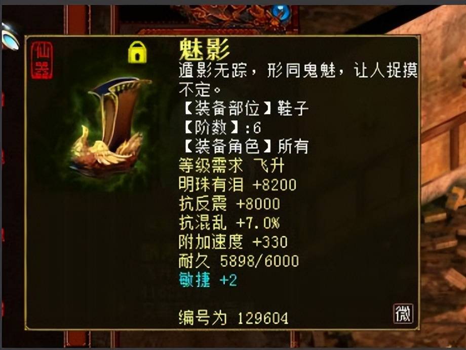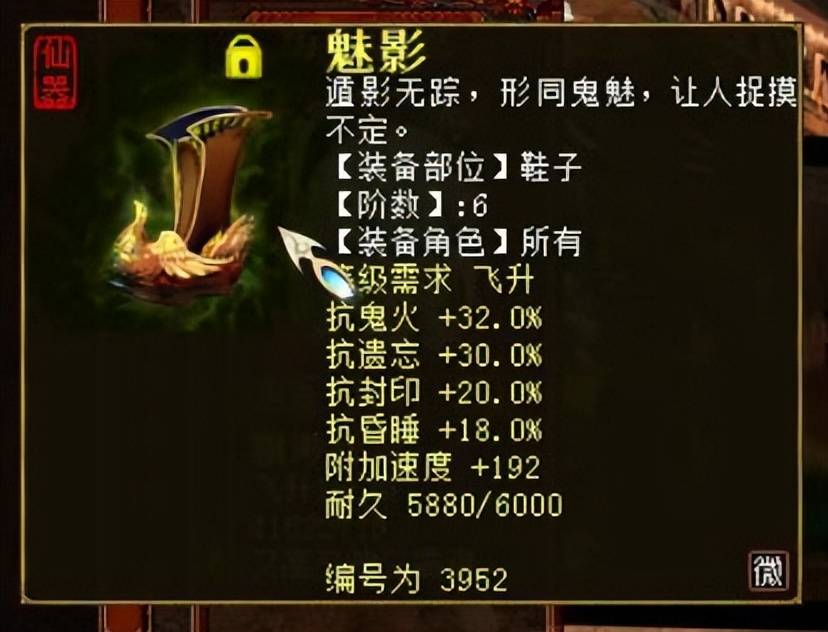 再来看另外一双鞋子,这双鞋子相对来说,主速度就少一些了,更多的还是追加在抗性上,附加速度仅有192,鬼火以及遗忘抗性占主流,封印、昏睡抗性做辅助,一般男人用这种鞋子的不多见,还是藕丝和步定以及抗仙法的仙器多一些,这样出装,披风、腰带是旧版的配饰可能性多一些。