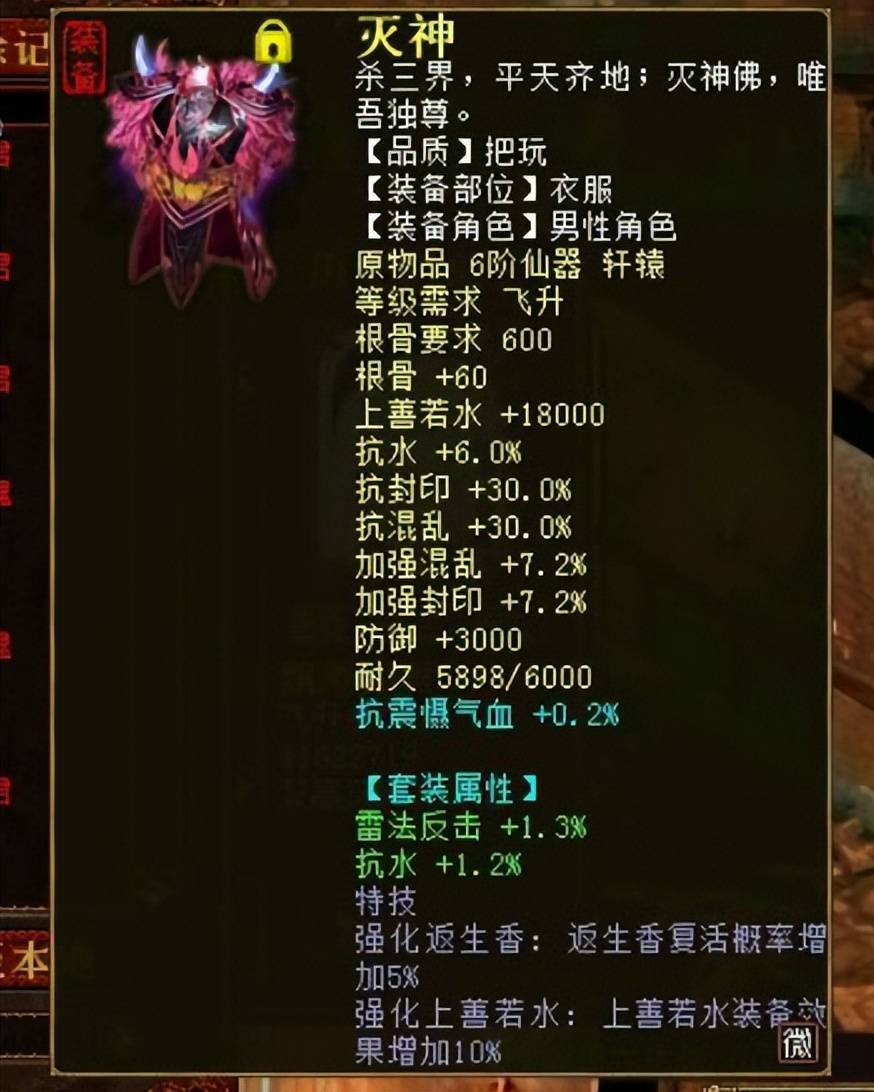 再来看这件衣服,虽然灭神套装的品质仅有把玩,但是这件装备的各项属性,即便放在2023年都是珍品,六阶仙器的底子,双特技强化返生香、强化上善若水,单凭这两条特技,市面上的六阶衣服能与之匹敌的少之又少。