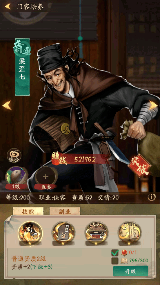 门客的副业基本上都是一样的,除了最后一个不一样之外。第一个技能财源广进是可以提升门客所委任的商铺赚速增加百分比赚速。