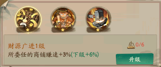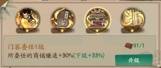 门客委任,这个技能加赚速是非常的快的,会增加门客所委任的商铺赚速而且是百分比的赚速加成。需要消耗算盘来进行升级。门客委任的有个小技巧,等级高的尽量往基础赚速比较高的商铺上委任。