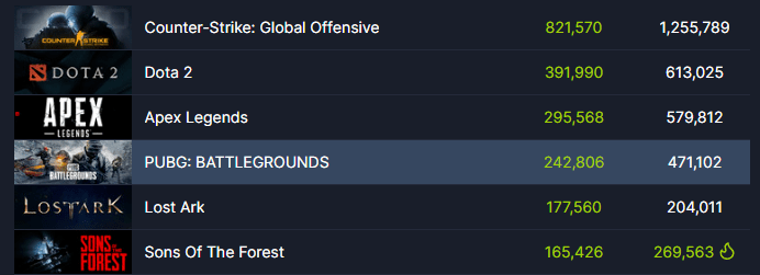 今天刚刚解锁的恐怖生存游戏《森林》续作《森林之子》体验版,在短时间内获得了最多的瞩目。解锁不久,《森林之子》的玩家在线人数达到26万,一度超过了CS:GO、Dota2、APEX等老牌多人在线竞技游戏,然后还压了《霍格沃茨之遗》一头。