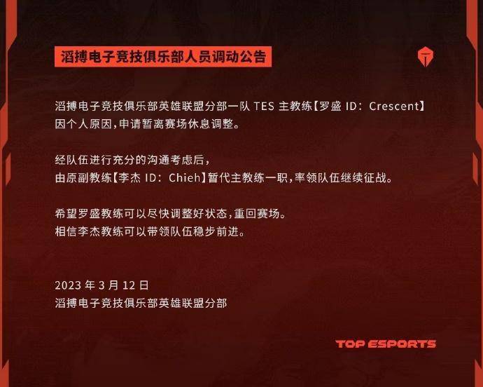 对于TES最近的表现,粉丝们自然是十分不满,而TES的赛训组以及教练也是因此受到了很多的诟病。然而没想到的是,就在3月12日晚,TES突然宣布主教练Crescent,也就是“白色月牙”因为个人原因,申请暂离赛场休息调整,而副教练Chieh则会顶替他的位置继续征战。