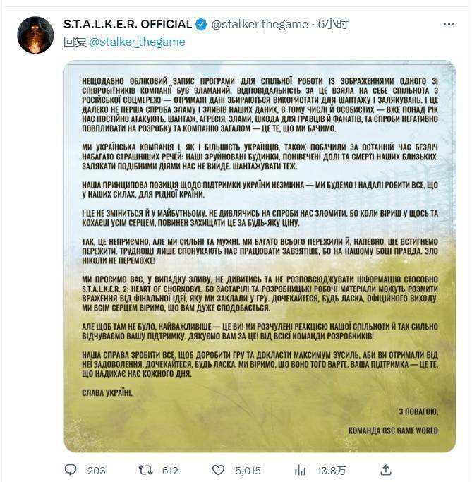 位于基辅的开发商GSC Game World在开发《潜行者2》过程中遇到了冲冲难题,主要是由俄乌冲突导致,而相关问题直到现在仍困扰GSC。最近,一批俄罗斯玩家非法获得了访问《潜行者2》游戏数据的权限,并且威胁泄露在网络上,GSC今日在Twitter上进行了回应。