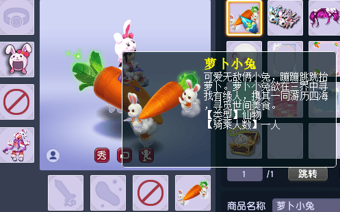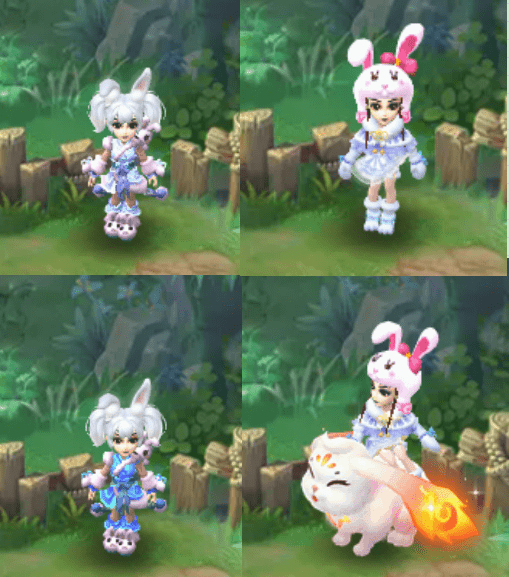 想起兔子,除了毛茸茸之外,就是它最爱吃胡萝卜!因此,祥瑞还可以选择萝卜小兔。值得注意的是,萝卜小兔一共有8种颜色!玩家可以根据锦衣、头饰的颜色,选择适合的萝卜小兔进行搭配。