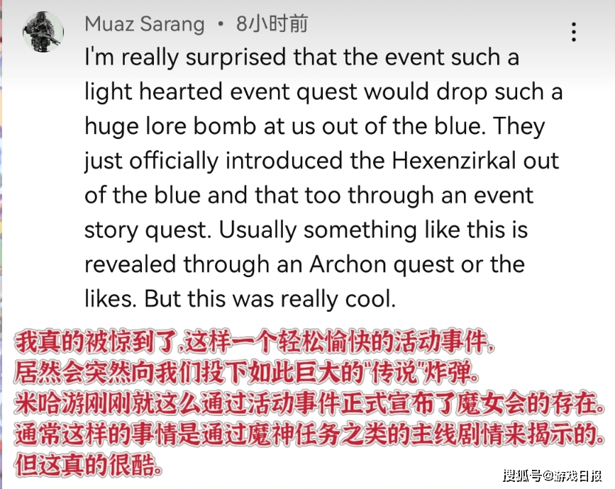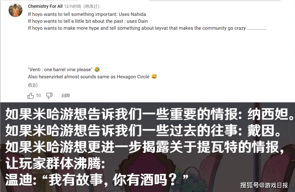 首先是玩家们对于原神新PV本身的探讨。老外玩家们得知了一些让他们感到震惊的消息,例如来自坎瑞亚的“黄金-莱茵多特”也是魔女会的成员、魔女会中同时存在着长生种和普通人等等。但给出的这些信息,却引发了更多的疑问。对于原神处处埋伏笔的行为,玩家们实在是又爱又恨,一众“原学家”脑洞大开,对于魔女们的身份、魔女会存在的意义和各位魔女在提瓦特大陆上担任的角色做出了自己的大胆猜测,引起了玩家们的疯狂讨论,吊足了大家的胃口。而剧情中同样解答了部分前期的疑问,使得剧情的叙述更加完整且具有条理。