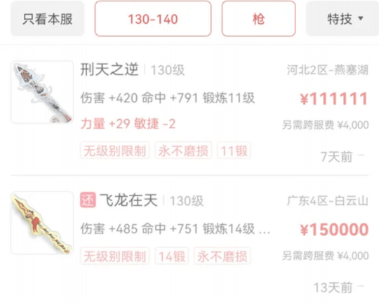 小生在藏宝阁搜索了130-140级的无级别不磨枪,发现最便宜那把也要11W。这也就意味如果提问玩家购买了那把枪并放至今天,就有至少十倍的利润。日常也有玩家在更换装备时不但没亏,偶尔还能赚钱,这也说明了一些高价值装备、宝宝是具有一定的保值性的。小生建议玩家们买卖装备时也要深思熟虑,说不定下个拿十倍的就是你!