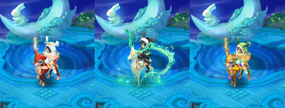 在为小鹿套装搭配祥瑞时,不仅可以选择新春祥瑞“钱兔似锦”和“福兔是福”,让自己的角色更加可爱以外,而且还可以乘骑“九色鹿”以及“仙缘战鹿”这些祥瑞。当小鹿装遇上这些仙鹿祥瑞后,可以让角色更有仙气,犹如天神或仙女下凡!