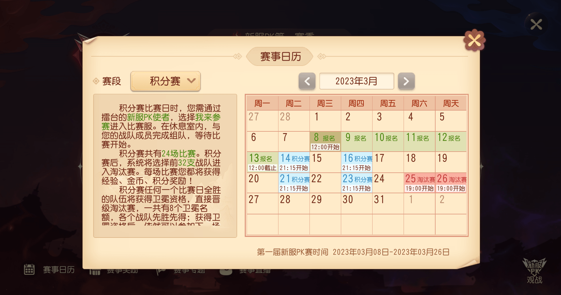本届新服PK赛的积分赛比赛日期为3月14号、16号、21号和23号,报名参赛的少侠不要忘记参赛哦~