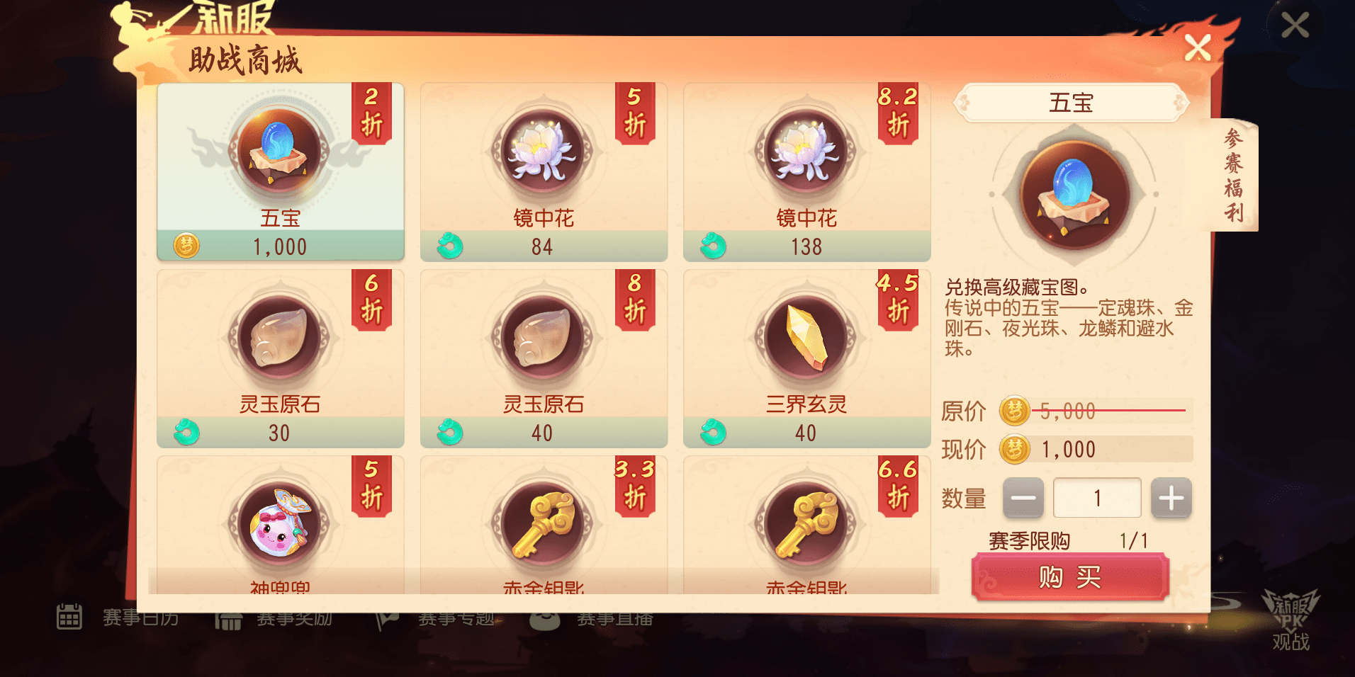 在整个赛事周期中,游戏内会开放【助战商城】助力赛事开展,少侠可以根据比赛成绩,挑选购买对应的道具。除了参赛阶段,32强、8强和4强也会对应解锁可购买道具,其中有【镜中花·鎏金】【90级书铁晶石】等道具;冠军还有机会购买【灵仙幻形玉】【神姿镜】!