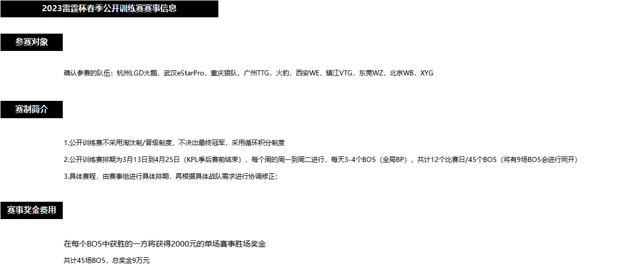 广大《王者荣耀》赛事爱好者,则可以通过此次公开训练赛,帮自己喜欢的战队挖掘一些表现比较亮眼的年轻选手。等到2023年KPL春季赛正式收官之后,雷霆杯第二阶段的比赛,也会随之展开!