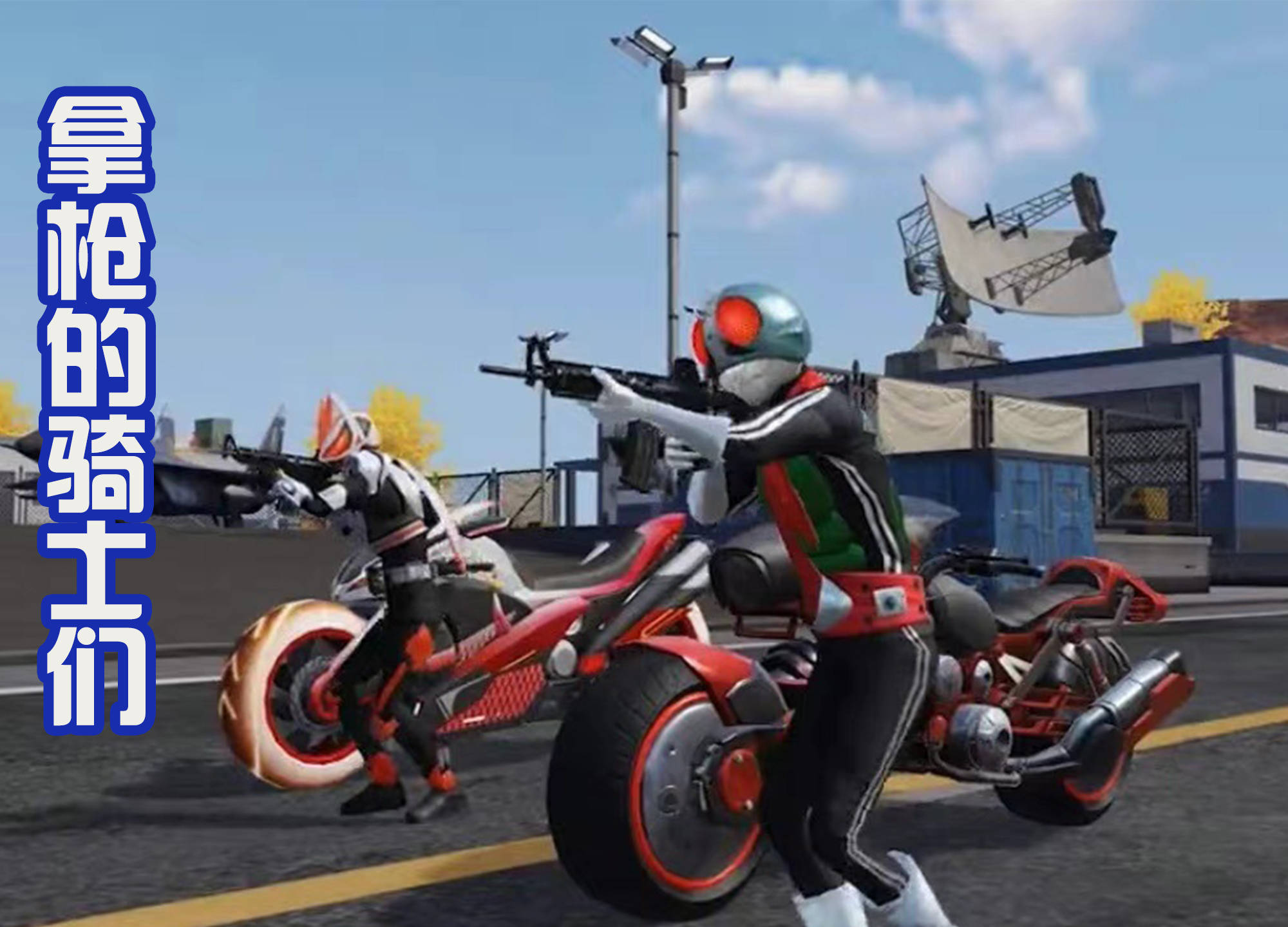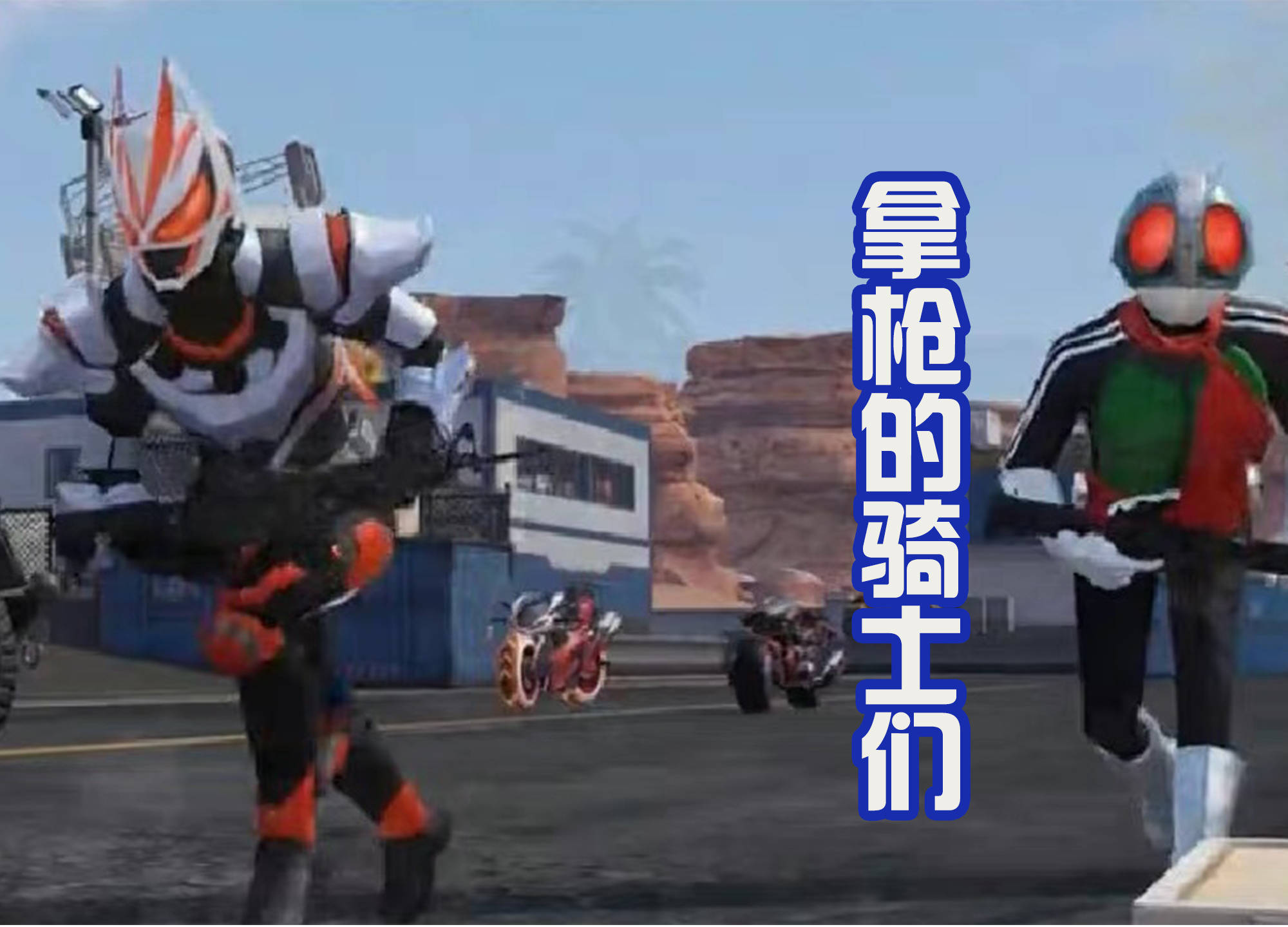 在目前曝光的宣传画面中,假面骑士极狐和假面骑士1号两位,都是拥有专属的摩托车,看起来造型是很帅气的。然后两人都是手中拿着枪械武器,这个画面让人有点绷不住,想起来了那句话“时代变了,大人”!就给人一种感觉,现在已经不是假面骑士们上去肉搏的时代,而是手中拿着枪械武器远程射击的时代,其实这也是为了贴合这个游戏“荒野行动”。