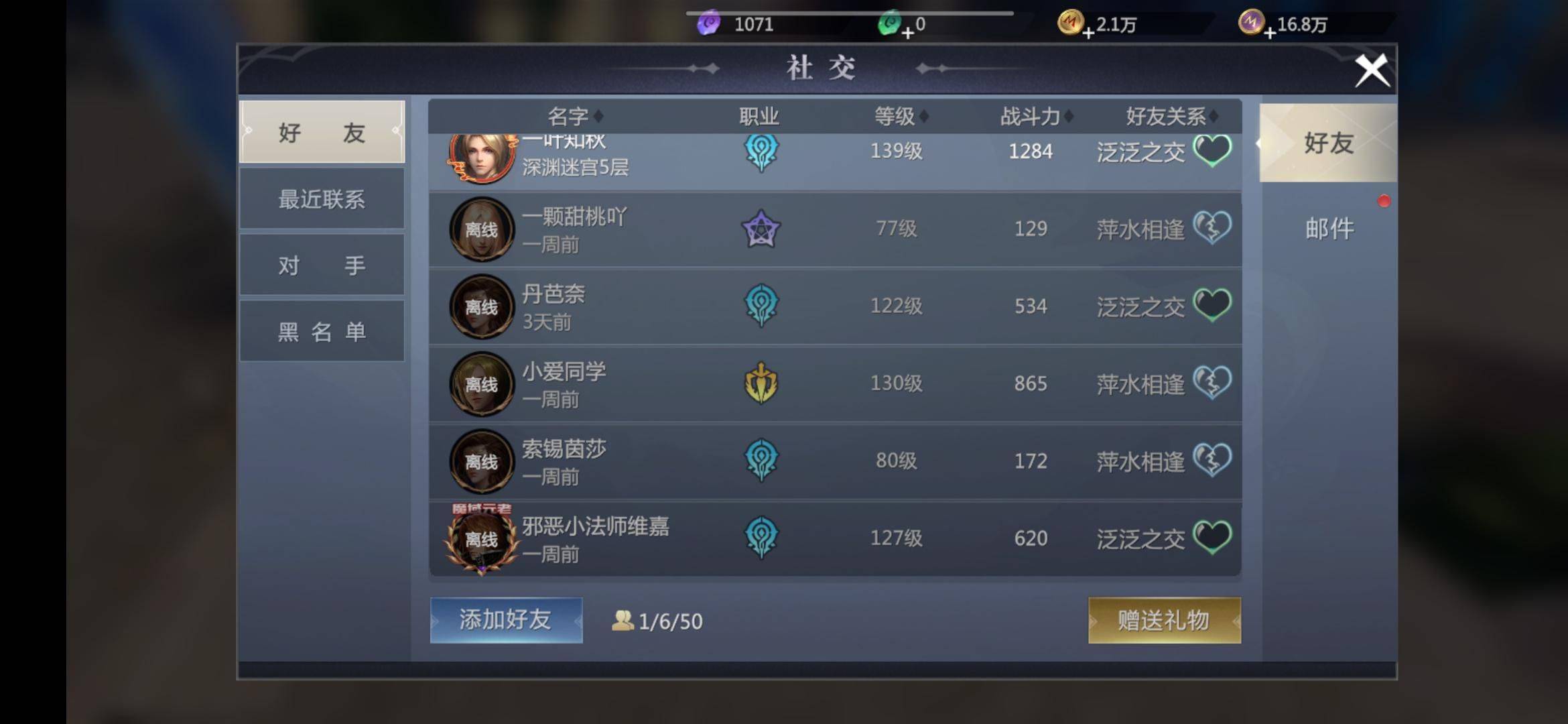 除了一些玩法,《魔域手游2》对游戏中的角色、战斗机制、社交玩法等部分都进行了优化升级,让玩家体验到了更多可能性。在社交玩法上可以轻松结交志同道合的好友,通过社交界面中可以查看好友、最近联系以及黑名单,在对手界面会显示对抗PK过的玩家信息和对战时间。在游戏中成为好友的玩家还可以根据亲密度获得不同的称号,例如萍水相逢、泛泛之交等关系说明。