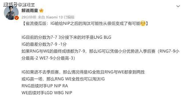 大家好,S13赛季的比赛已经正式开始了,相信绝大多数的玩家都关注了最近一段时间的对抗,lpl赛区的比赛是非常激烈的。这几天,随着常规赛逐渐接近尾声,lpl赛区的季后赛争夺也是变得越来越激烈,解说雨童也是再次发挥出了自己的分析能力,本来ig战队是一个天胡开局,在初期就拿到了非常不错的成绩,甚至领跑了lpl赛区,但是在最近的比赛中却接二连三的失败,甚至有机会会被淘汰了。从他的分析中能够看到,排名靠前的几支战队基本没有任何问题,拿到八胜的队伍都差不多锁定了名额。