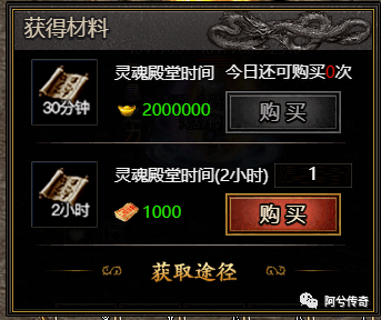 灵魂殿堂地图都是"时间地图",需要购买地图时间才可进入。消耗200万元宝可以购买30分钟时长,消耗1000灵符则可以购买2小时时长