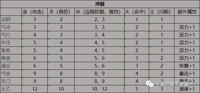 4、冲脉:冲脉为经脉系统的第四条脉,达到一定元气值能够开启冲脉。冲脉分别为:会阴、气冲、气穴、中注、盲俞、商曲、通谷、气舍、关门、太乙。